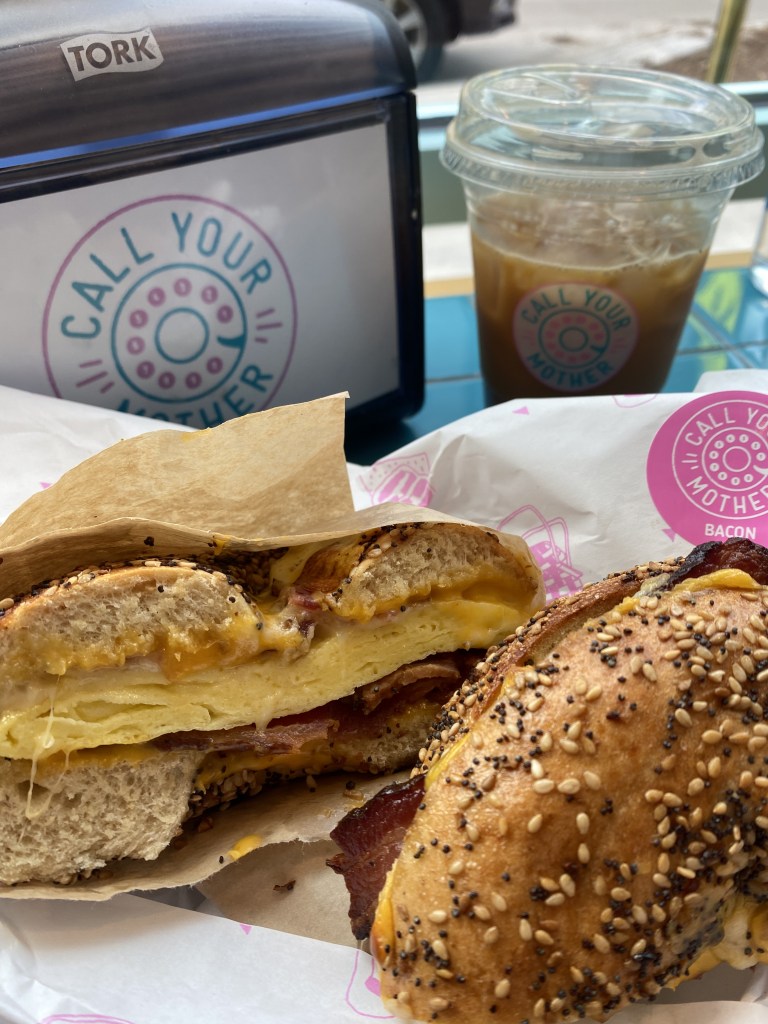 Bacon Egg and Cheese on an everything bagel with a Pumpkin Dulce de Leche Latte